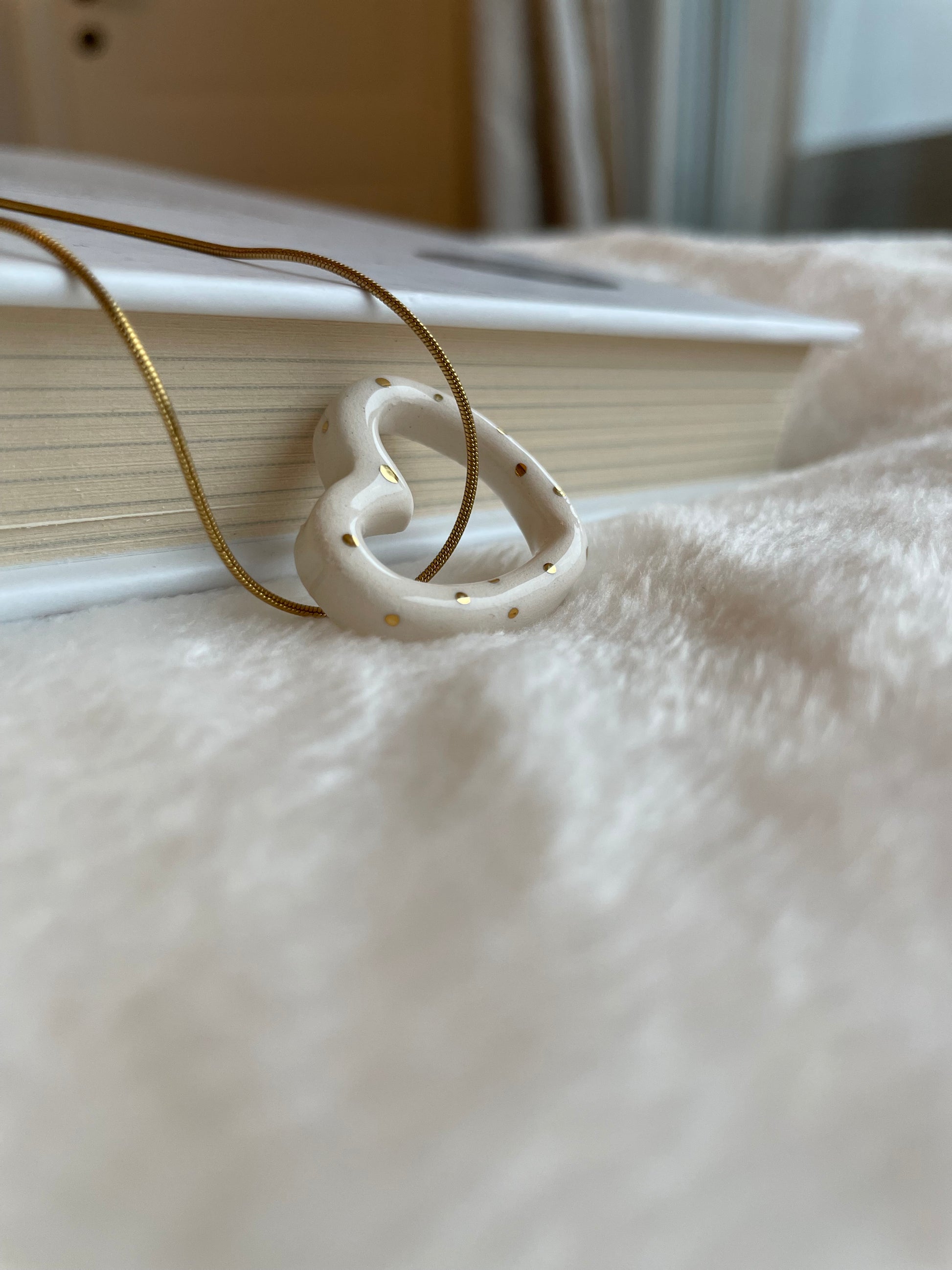 Nežna verižica iz nerjavečega jekla v barvi zlata z unikatnim ročno oblikovanim keramičnim obeskom, oplemenitenim s pridihom zlata.